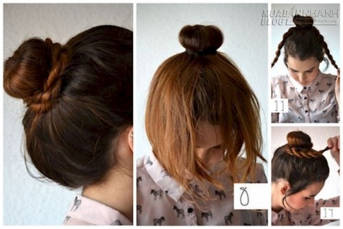 Kiểu búi tóc này vừa gọn gàng, lại đem đến cho bạn vẻ ngoài rất rạng rỡ và sang trọng. Trước tiên, bạn hãy búi tó thành một búi tròn cao phía sau đầu đơn giản, và để thừa ra 1 đoạn đuôi tóc. Sau đó chia đuôi tóc này làm 2 phần rồi với mỗi phần tóc, hãy tết 3 bình thường. Cuối cùng, bạn quấn từng bím tóc đã tết quanh chỗ thắt nút của búi tóc để có cảm giác như đây là chun buộc, rồi khéo léo cố định lại với cặp tăm là xong.
