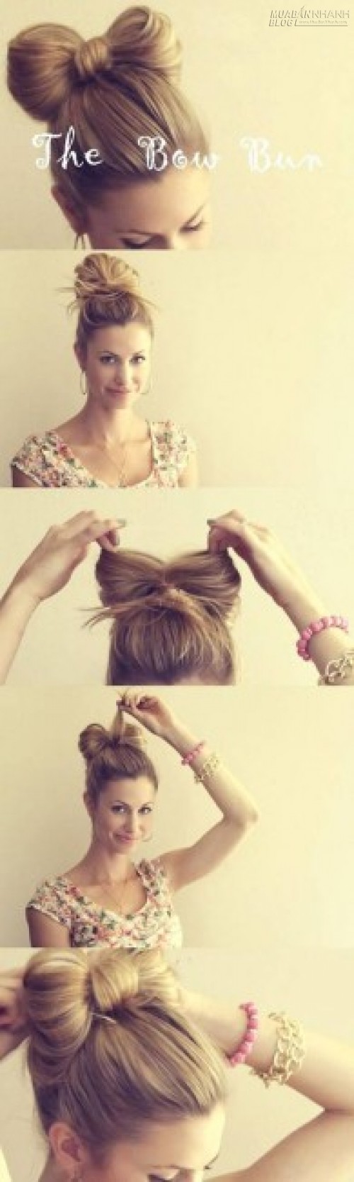 Kiểu tóc này khá đơn giản và đáng yêu, mà chỉ mất có 2 phút thực hiện thôi nhé. Trước tiên, bạn hãy thu tóc về thành một búi cao sau đầu, nhớ để lỉa chỉa một vài lọn đuôi tóc thừa thật cố ý. Sau đó hãy chia búi tóc lộn xộn thành 2 nửa rồi kéo phần lọn tóc thừa qua và cố định bằng cặp tăm tại phía sau. Chỉnh trang thêm một chút là bạn đã có cho mình một chiếc nơ xinh trên đầu rồi!