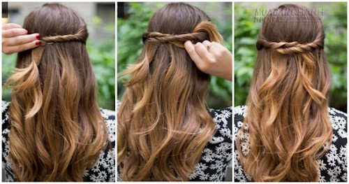 Kiểu tóc này quá dễ thương mà chắc chắn không cô gái nào có thể chối từ! Đầu tiên, hãy gài một chiếc dải buộc đầu có họa tiết thật đẹp lên tóc, sau đó lấy một phần tóc từ nửa một bên đầu luồn qua chiếc dải này và tiếp tục cho đến đoạn giữa sau đầu. Bạn lặp lại tương tự với phần tóc nửa đầu bên kia là hoàn thành.
