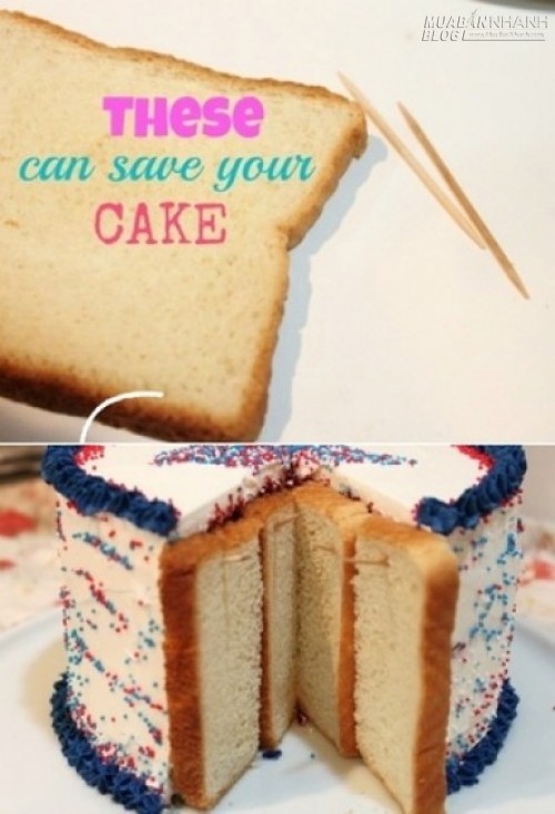 Thỉnh thoảng cũng có những chiếc bánh kem khá to mà bạn không thể ăn hết một lần, để tủ lạnh thôi chưa đủ, vì bánh bông lan một khi đã cắt sẽ rất dễ bị khô nên cách sau đây sẽ khiến mọi việc trở nên dễ dàng hơn. Bạn cắt nhỏ một lát bánh mì sandwich, sau đó “dán” vào chiếc bánh rồi rồi tăm tre để đính lại.