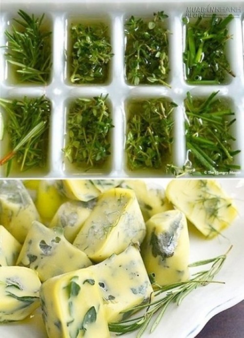 Bỏ rau mùi vào trong khay đá, đổ đầy bằng dầu olive rồi bỏ vào ngăn đá, cứ cần dùng đến thì lấy ra thôi. Thế là bạn không sợ thiếu rau mùi để làm sốt hay ướp thực phẩm rồi nhé!