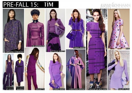 Nhiều sắc thái của màu tím như lilac, hoa cà, tím chàm tạo nên sự mới mẻ cho xu hướng thời trang giao mùa 2015. Trong khi Christian Siriano, Rhie thể hiện trên váy áo bay bổng, lãng mạn thì Tomas Maier, Antonio Marras hay Philipp Plein khai thác kiểu dáng đơn giản, dễ vận dụng trong những set đồ công sở, dạo phố hàng ngày của các cô gái.