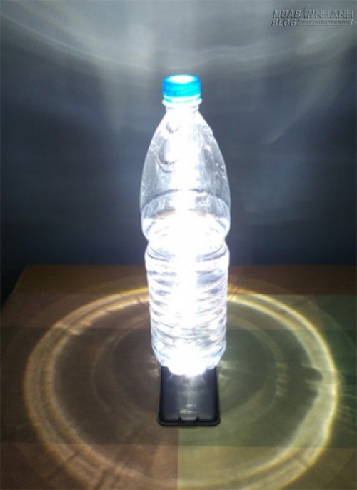 Đặt một chai đầy nước lên trên đèn flash. Lúc này, đèn flash của bạn sẽ được khúc xạ thành sáng hơn, có thể chiếu sáng cả căn phòng nhỏ mà không gây chói mắt.
