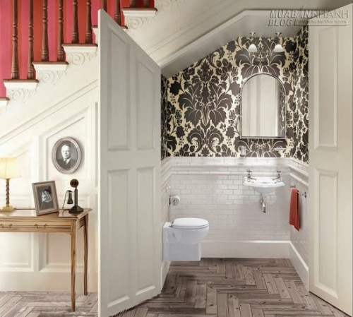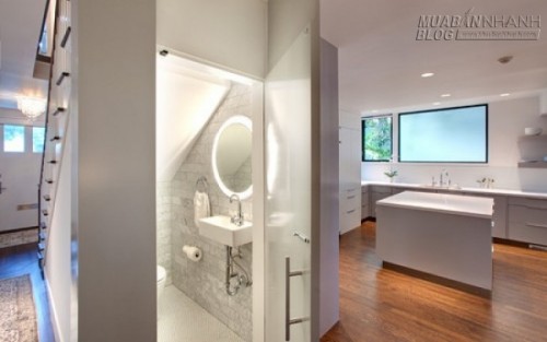 Đối với những gia đình có gầm cầu thang đủ rộng, thì việc giấu vào đó một nhà vệ sinh cũng là phương án hợp lý.