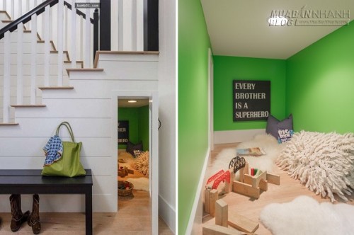 Trẻ con thích những điều cổ tích và viễn tưởng, kiểu như ngôi nhà nhỏ xinh của Bạch Tuyết và 7 chú lùn, hay tổ ấm bé xíu của các nhân vật hoạt hình. Gầm cầu thang có thể nhỏ trong mắt bạn, nhưng sẽ là một không gian lớn trong mắt lũ trẻ, hãy tận dụng để làm điều đó. Chắc chắn chúng sẽ thích ở đó còn hơn là nằm trên giường ngủ bình thường.