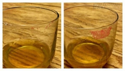 Bức hình bên trái là chiếc cốc đã được liếm miệng trước khi uống và bức ảnh bên phải để lại vết son rất đậm khi bạn không liếm miệng cốc.