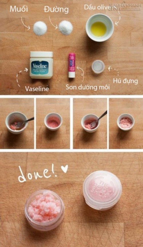 2. Để có làn da môi bóng mượt khi tô son, bạn hãy bôi một ít hỗn hợp dưỡng môi bao gồm: Muối, đường, dầu olive, vaseline và son dưỡng môi.