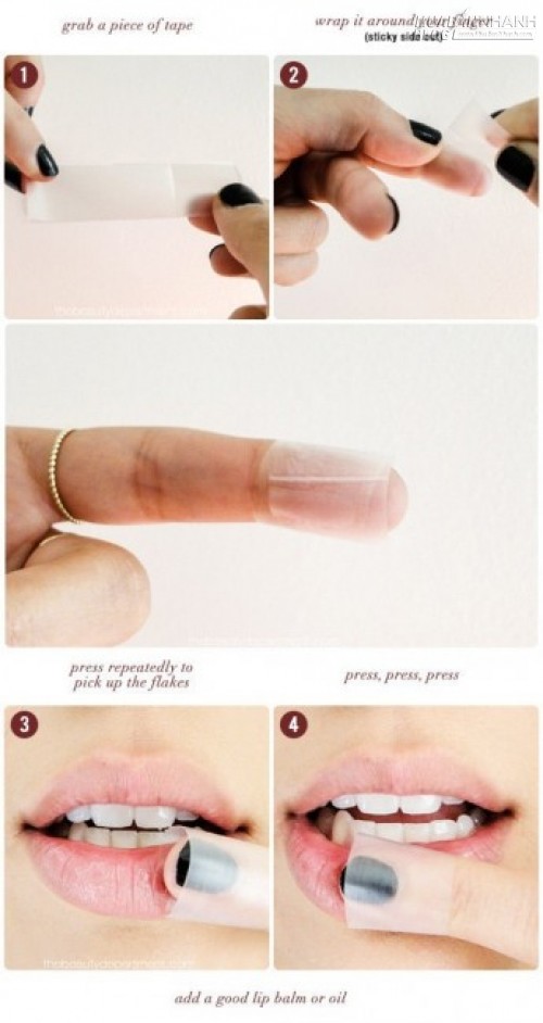 3. Hoặc nếu lười biếng thì bạn có thể khắc phục làn da môi nứt nẻ bằng cách sử dụng miếng băng dính quần đầu ngón tay, sau đó dậm đều lên vết vảy đóng trên môi để chúng bám vào phần băng dính. Tiếp đó, bôi một ít son dưỡng môi, tiếp tục dậm đều.