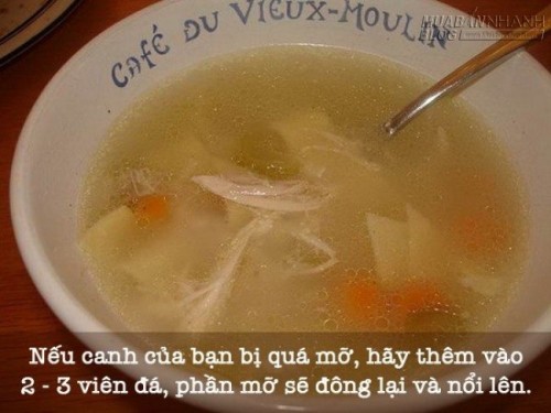 - Nếu bạn lỡ tay cho quá nhiều dầu mỡ vào nồi canh, hãy thêm vào 2-3 viên đá, phần mỡ sẽ đông lại và nổi lên. Bạn hớt đi là xong.