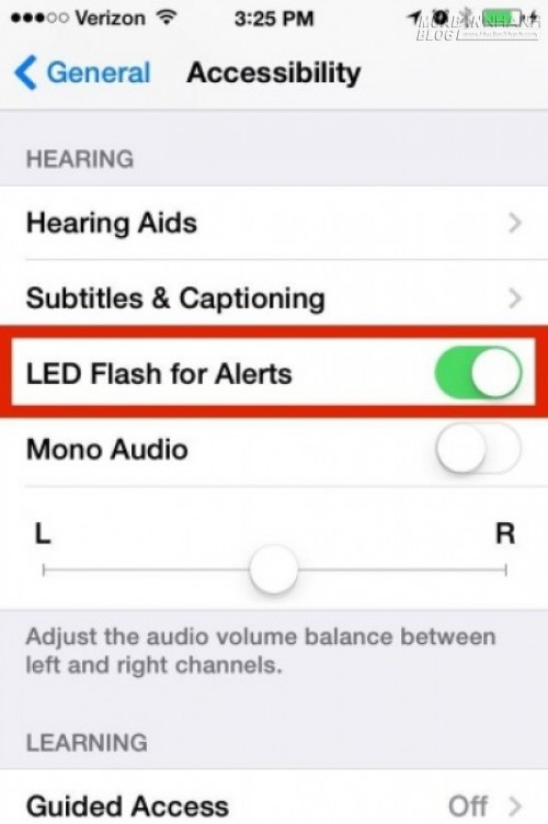Với báo rung, chuông truyền thống, thiết bị sẽ sử dụng đèn flash để báo hiệu cập nhật tới người dùng. Để bật tính năng này, bạn vào Settings - General - Accessibility sau đó bật tính năng "LED Flash for Alerts". Lưu ý: Bạn cần khởi động lại máy để tính năng này bắt đầu hoạt động.
