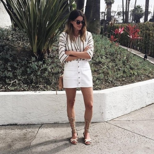 Xu hướng chân váy da lộn hoặc chân váy denim cài cúc đang trở thành một cơn sốt trong mùa này. Bạn có thể tùy ý lựa chọn độ dài phù hợp với mình. Các dáng váy xòe hay váy chữ A là kiểu váy dễ mặc nhất, rất hợp với mọi vóc dáng, đều khiến bạn nhìn cân đối và tự tin hơn.
