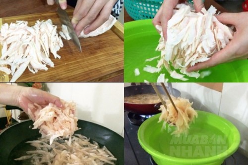 2 trái bưởi: gọt vỏ xanh, lấy phần trắng, phơi hơi héo rồi cắt nhuyễn và ngâm trong nước lạnh với ít phèn chua trong 10 phút. Nhồi, xả thật kỹ để vỏ bưởi không còn đắng. Sau đó trụng vỏ bưởi khoảng 10-15 phút vớt ngâm vào nước lạnh, dùng máy xay sinh tố xay nhẹ, vắt thật ráo.