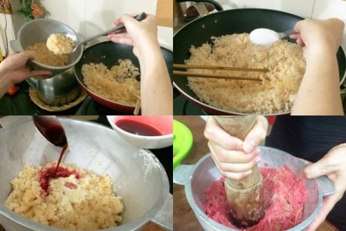Gạo rang vàng, giã nhuyễn làm thính gạo.