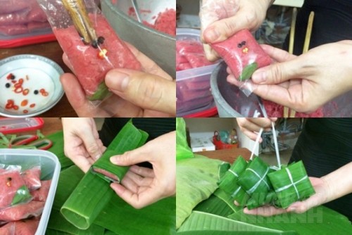 Dùng bọc nhỏ, để lá ổi hay rau răm vào, cho thành phẩm vào với hạt tiêu, lát ớt, gói lại bằng lá chuối rồi cột dây nylon. Sau đó buộc thành chùm.