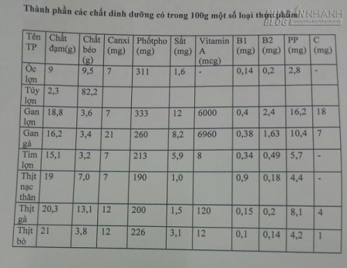 Thành phần các chất dinh dưỡng có trong 100 gram một số loại thực phẩm.