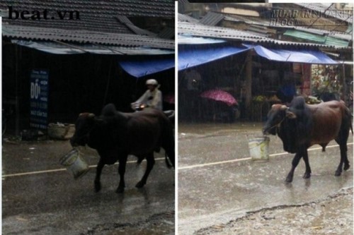 Bức hình chú bò tại Tuyên Quang đeo chiếc xô phía trước, vừa đi vừa dừng lại uống nước trong xô dưới trời mưa đã khiến dân mạng cực kì thích thú.