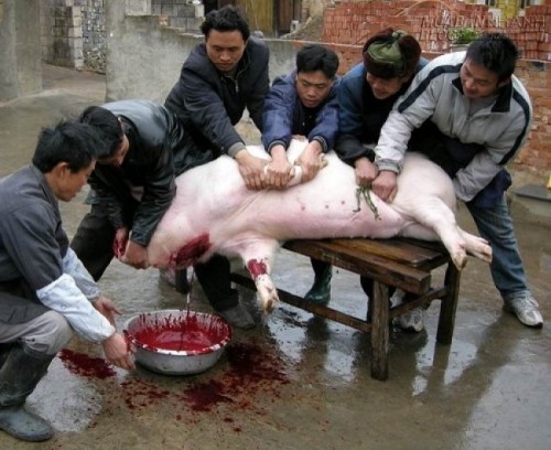 Tờ Hoa Tây Đô Thị (Trung Quốc) đưa tin ngày 10/12, để phục vụ cho dịp Tết Nguyên Đán sắp tới, gia đình anh Lý Kim Diễm, sống tại thôn Thổ Môn, huyện Giáp Giang, tỉnh Tứ Xuyên, Trung Quốc đã quyết định mổ thịt con lợn nuôi vừa đầy năm, nặng gần tạ rưỡi và một con dê. Đây cũng là truyền thống của người dân nông thôn Trung Quốc từ bao đời nay vào mỗi dịp cuối năm.
