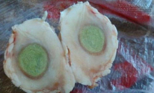 Vì không hiểu nó là vật gì, anh Lý để nó vào tủ lạnh. Hai ngày sau, anh lấy nó ra ngắm nghía và dùng dao cẩn thận bổ đôi xem thực hư. Thật bất ngờ, bên trong cục tròn này không phải là thịt hay mỡ mà là nhân màu vàng xanh chẳng khác gì lòng đỏ trứng vịt muối. Hơn nữa mùi của nó cũng rất nặng giống như là ngâm thuốc bắc lâu ngày.