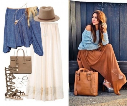 Những chuyến đi mùa hè trở nên lãng mạn khi nàng chọn cho mình cặp đôi áo trễ vai và chân váy maxi (Ảnh trái: Áo: Asos, váy: Victoria's Secret, túi: Saint Laurent)