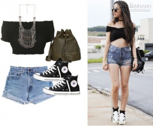 Những chiếc áo trễ vai dáng crop-top khiến bạn trở nên thật trẻ trung, gợi cảm khi mặc với quần shorts jean, giày thể thao (Ảnh trái: Áo: Topshop, quần: Levi's, giày: Converse)