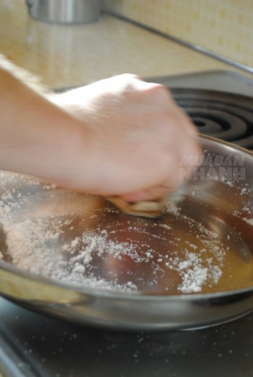 Rắc một lượng muối lên chảo, dùng khăn giấy hay tấm vải sạch chà mạnh tay lên muối, dầu theo chuyển động tròn ở cả thành chảo và đáy chảo, hệt như bạn đang đánh bóng chảo đấy.