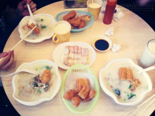 Bữa sáng với cháo trứng bắc thảo, quẩy nóng và sữa đậu nành. |