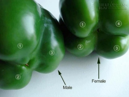 1. Một mẹo hay để lựa ớt chuông. Nhìn hình, ta thấy quả bên trái là ớt đực, bên phải là ớt cái. Ớt cái nhiều hạt, ngọt hơn và ngon hơn khi ăn sống. Ớt đực dùng nấu chín ngon hơn ớt cái.