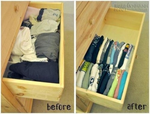 3. Nếu ngăn tủ chật, bạn có thể cuộn đồ thay vì xếp đồ theo cách thông thường, sẽ tiết kiệm được một diện tích kha khá đấy.