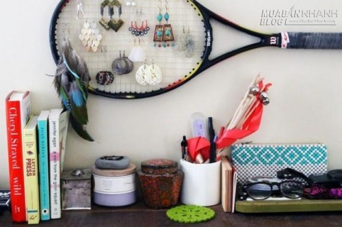 6. Dùng vợt cầu lông làm giá treo khuyên tai. Trang trí nhà cửa bằng cách này cũng khá ấn tượng đúng không?