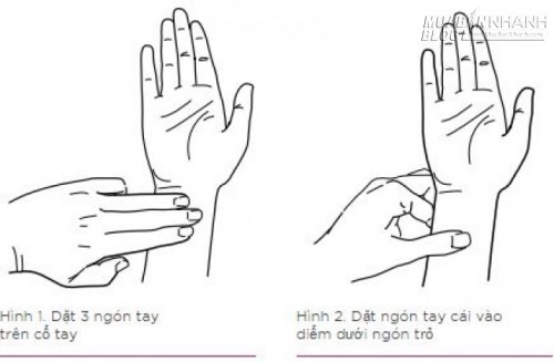 Bước 2: Để tìm điểm áp lực P-6, hãy đặt 3 ngón tay (trỏ, giữa, áp út) của bàn tay còn lại trên cổ tay phải (Xem hình 1). Sau đó, đặt ngón tay cái vào vị trí ngay dưới ngón tay trỏ của bạn (Xem hình 2). Nếu cảm thấy 2 gân lớn dưới ngón tay cái là bạn đã tìm đúng vị trí huyệt P-6 rồi nhé.