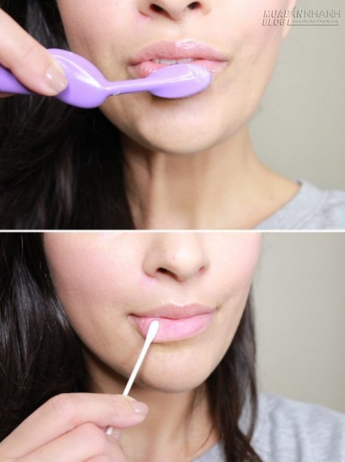 - Trộn 1 thìa cà phê dầu dừa với lượng đường vừa đủ, sau đó dùng bàn chải mềm nhúng vào hỗn hợp này rồi chà lên môi để thực hiện công đoạn tẩy da chết. Khi làm xong, bạn dùng một chiếc bông ngoáy tai ẩm lau khô đi lớp hỗn hợp này để làm sạch môi.