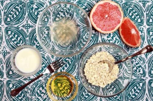 - Ép/vắt lấy nước từ quả bưởi, sau đó trộn lẫn bột yến mạch, sữa chua và mật ong với định lượng đã chuẩn bị lại với nhau cho đến khi đạt được một hỗn hợp kem mềm mại và đặc sánh.