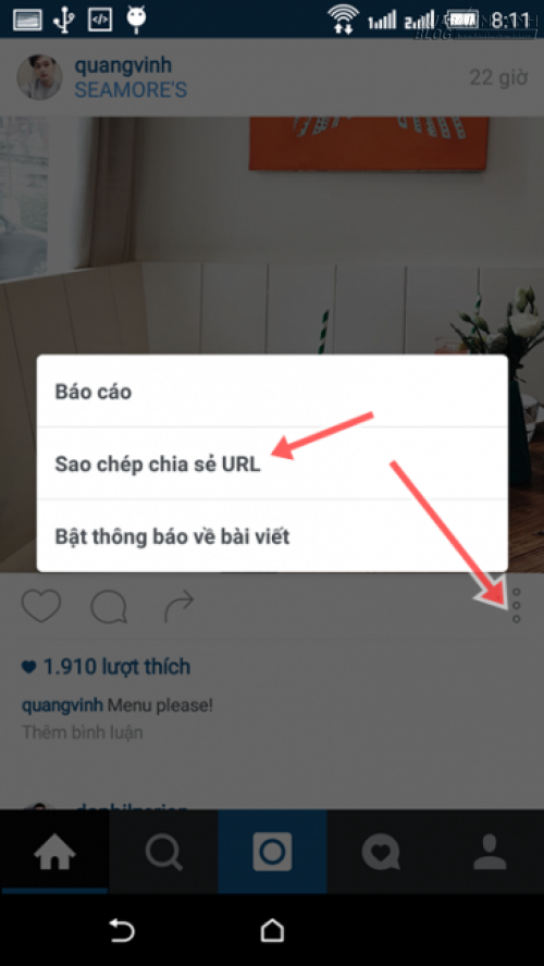 Sau khi tải về, bạn hãy truy cập vào Instagram, sau đó tìm đến “tác phẩm” mình muốn tải, nhấn vào biểu tượng 3 chấm ở góc phải bên dưới tác phẩm và nhấn vào tùy chọn Sao chép chia sẻ URL.