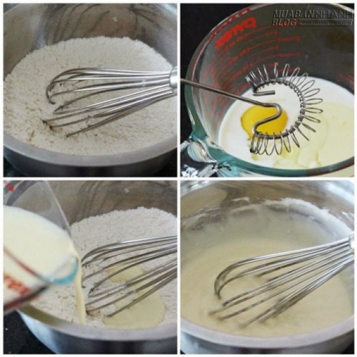 - Đổ hỗn hợp các nguyên liệu ướt vào các nguyên liệu khô, từ từ khuấy cho chúng hòa quyện.