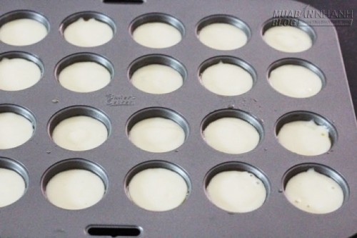 Sử dụng một muỗng nhỏ, múc bột vào khuôn. Lưu ý chỉ múc đầy 2/3 mỗi khuôn để bánh còn nở. Giỗ nhẹ chảo vào mặt bàn để loại bỏ các bong bóng khí.
