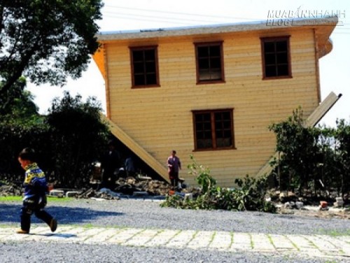 Nhà lộn ngược, Trung Quốc Nếu bạn thích cảm giác nhảy múatrên trần nhà,hãy đến làng tranh dân gian Trung Quốc, thuộc thị trấncổ Fengjing, phía nam Thượng Hải. Bên trong, mọi thứ từ bàn ăn tối đếngiường ngủ trẻ emđều được sắp xếp với vị trí thách thức trọng lực. |