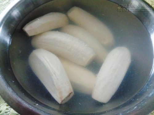 Bước 2: Chuối lột vỏ ngâm vào tô nước chanh 2 phút. Sau đó vớt chuối ra lau khô nước trước khi bào lát.