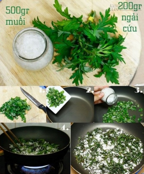 - Cắt nhỏ 200g lá ngải cứu trộn với 500g muối hạt to rồi rang lên.
