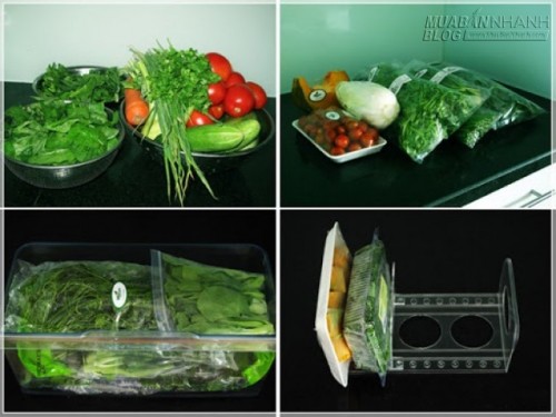 Rau củ quả: Nhà mình ăn nhiều rau quả, nên đương nhiên rất chú trọng đến việc bảo quản rau quả sao cho tươi lâu. Mình thường mua rau ở cửa hàng rau sạch, vừa yên tâm về an toàn thực phẩm, vừa tiện vì đã được đóng gói sạch đẹp, chỉ việc cho vào ngăn rau tủ lạnh, nếu thiếu chỗ thì trưng dụng thêm các ngăn mát, bảo quản được khá lâu. Với những thứ mua ở chợ thì mình làm sạch rau củ, loại thì để ráo, loại nào cần thiết thì làm khô bằng rổ quay rau, sau đó cho vào hộp nhựa có nắp, bao zipper hay các khay đựng cho những loại không cần đậy kín. Có thể lót thêm giấy thấm nếu rau chưa thật sự khô. Làm như vậy, rau củ quả sẽ được giữ tươi suốt tuần và khi đem ra nấu chỉ việc xả sơ dưới vòi.