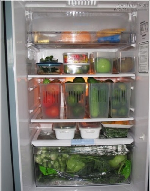 Do đó mình thích dùng các loại hộp và khay dài (có nắp hoặc không nắp tùy theo chế độ bảo quản) để tận dụng chiều sâu và chiều cao. Khi xếp như vậy, mình có thể quan sát hết các món đồ, khi cần lấy món nào có thể rút ra dễ dàng, lại giúp khí lạnh lưu thông giữa các hộp đựng tốt hơn. Nếu sắp xếp theo chiều ngang của tủ lạnh, thì ngoài việc phải nhấc các hộp bên ngoài để lấy các hộp bên trong, đôi khi cái đầu đãng trí của chúng ta còn quên bẵng mất ở phía trong đang có thứ gì, chưa kể đến hiện tượng đông đá ở các hộp bên trong và kém lạnh ở các hộp bên ngoài có thể xảy ra nếu xếp sát quá, ảnh hưởng không tốt đến chất lượng thực phẩm.