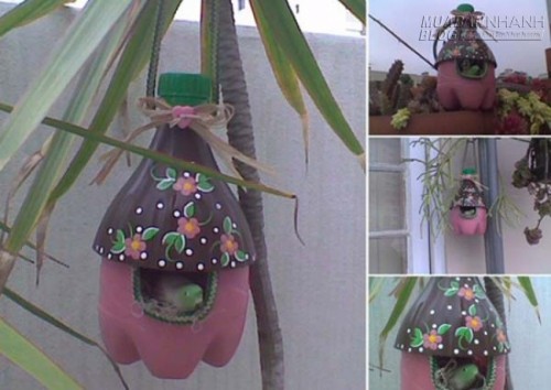 19. Đồ đựng thức ăn cho chim đẹp mắt được làm từ chai nhựa.