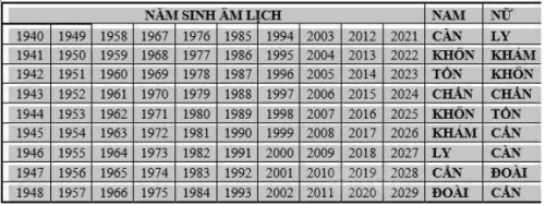 Mọi người dò năm sinh của mình rồi nhìn sang cột nam/nữ để có cung mệnh. Sau đó đối chiếu kết quả của vợ chồng với nhau, mọi người sẽ được kết quả: