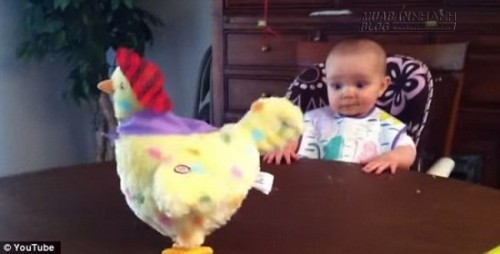 Đoạn video được đưa tài khoản có tên Shkesi đưa lên Youtube cho thấy bé gái dường như bị ‘”mê hoặc” bởi một con gà mái đẻ trứng bằng đồ chơi. Con gà đồ chơi này “đẻ trứng nhựa” chạy bằng pin và nó có thể vừa đẻ vừa hát.