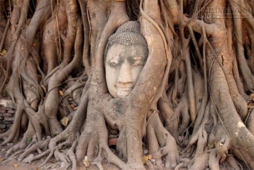 Tuy nhiên, hình ảnh khiến nhiều người tới Ayutthaya nhớ nhất chính là hình mặt phật được bao bọc trong rễ cây ở chùa Wat Mahathat. Một khuôn mặt đẹp, thánh thiện và siêu thoát đem lại cảm giác bình an cho mọi người. Nhiều người ở Thái Lan đồn rằng trong lúc cố đô bị phá hoại, một binh lính nào đó đã đặt đầu của pho tượng vào gốc cây. Trải qua bao nhiêu năm tháng, những chùm rễ theo thời gian đã vươn ra và ôm trọn lấy khuôn mặt đức Phật tạo thành một bức tranh sống động và lạ kỳ. Wat Mahatat với những tàn tích huy hoàng là hàng loạt pho tượng Phật không đầu bên cạnh nền móng và những bức tường thành đổ nát bằng gạch đỏ.