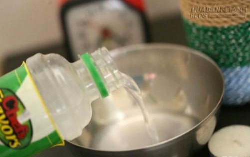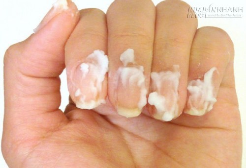 Trộn đều hai dung dịch với nhau cho đến khi có được một hỗn hợp hòa tan là được. Bôi hỗn hợp lên móng tay trong khoảng 3 phút. Sau đó rửa sạch lại với nước ấm.