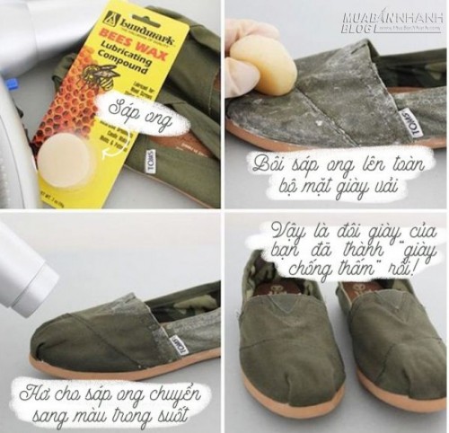 Những đôi giày vải rất dễ thấm nước. Để khắc phục điều này, hãy bôi sáp ong lên mặt vải, sau đó dùng máy sấy hơ nóng cho đến khi lớp sáp ong màu trắng hoàn toàn biến mất.