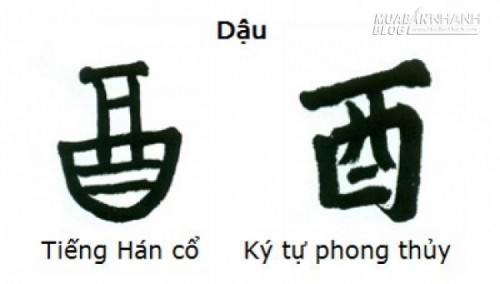 Hình tượng Dậu (gà) trong tiếng Hán cổ (bên trái) gần giống với ký tự rượu trong tiếng Hoa hiện đại và trông như chiếc bình có thể đựng và vận chuyển bất cứ thứ gì. Ký tự phong thủy (bên phải) của Dậu cũng gây ấn tượng tương tự, nhưng sắc nét hơn.
