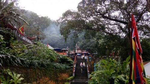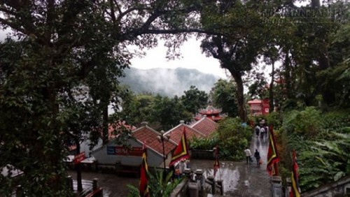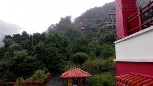 Vượt 2 km đường bộ từ đền Trình sẽ đến khu vực cáp treo. Với 200.000 đồng/vé khứ hồi, khách được cáp treo đưa dần lên cao, dọc đường đi, những đám mây mờ phủ lấy ca bin. Xa xa, những ngọn núi cao mờ ẩn trong sương, thấp thoáng trong màu xanh núi rừng là những mái ngói đỏ uống cong của vài ngôi chùa, những ngọn suối tung nước trắng xóa khiến du khách thấy lòng nhẹ nhàng, buông bỏ hết mọi bon chen của cuộc sống đề về với cõi tiên.