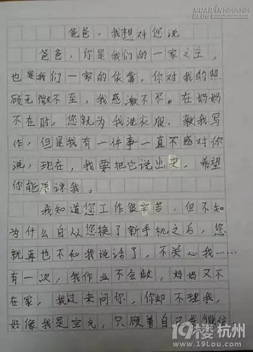 Ngày 8/12 vừa qua, trên trang mạng 19lou, một người đàn ông có tên là Nghệ Lam đến từ Hàng Châu (Trung Quốc) đã đăng tải bức thư mà đứa con trai mới học lớp 3 viêt cho mình. Trong đó viết những dòng rất đau lòng: “Kể từ khi bố đổi điện thoại mới, chúng ta chẳng con nói chuyện với nhau nữa, bố cũng chẳng quan tâm đến con nữa…Trong khi bố là người mà con yêu quý nhất, tại sao bố lại có thể đối xử với con lạnh nhạt như vậy”.