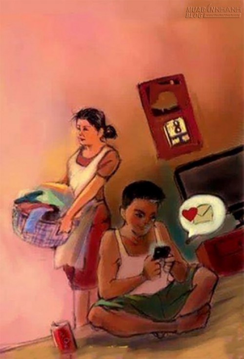 Thứ nhất là : Người chồng thảnh thơi nhắn tin với người tình còn vợ thì tất bật với việc nhà